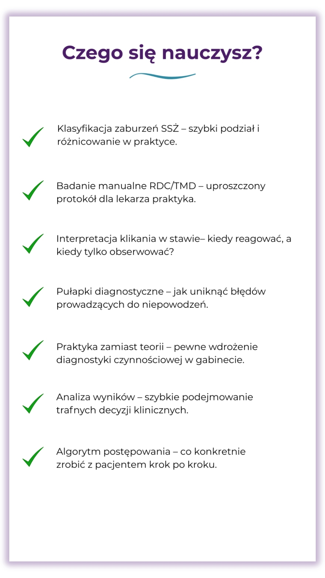 Dla każdego lekarza praktyka. Niezależnie od stopnia zaawansowania, każdy wyniesie z tego spotkania konkretne wskazówki. Dr Klara Saczuk dzieli się wiedzą z bardzo wąskiej, specjalistycznej dziedziny (Zaburzenia Narządu Żucia), której rzadko uczy się w tak praktyczny sposób na studiach czy ogólnych kursach.